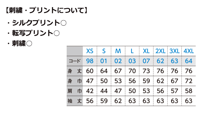 サイズ、刺繍・プリント加工対応