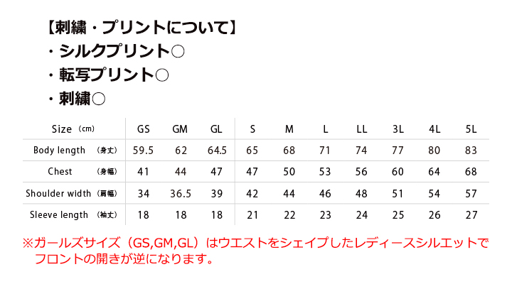 ※GS、GM、GLサイズはウエストをシェイプしたレディースシルエットです。