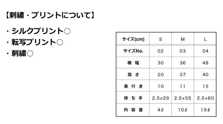 サイズ、刺繍・プリント加工対応